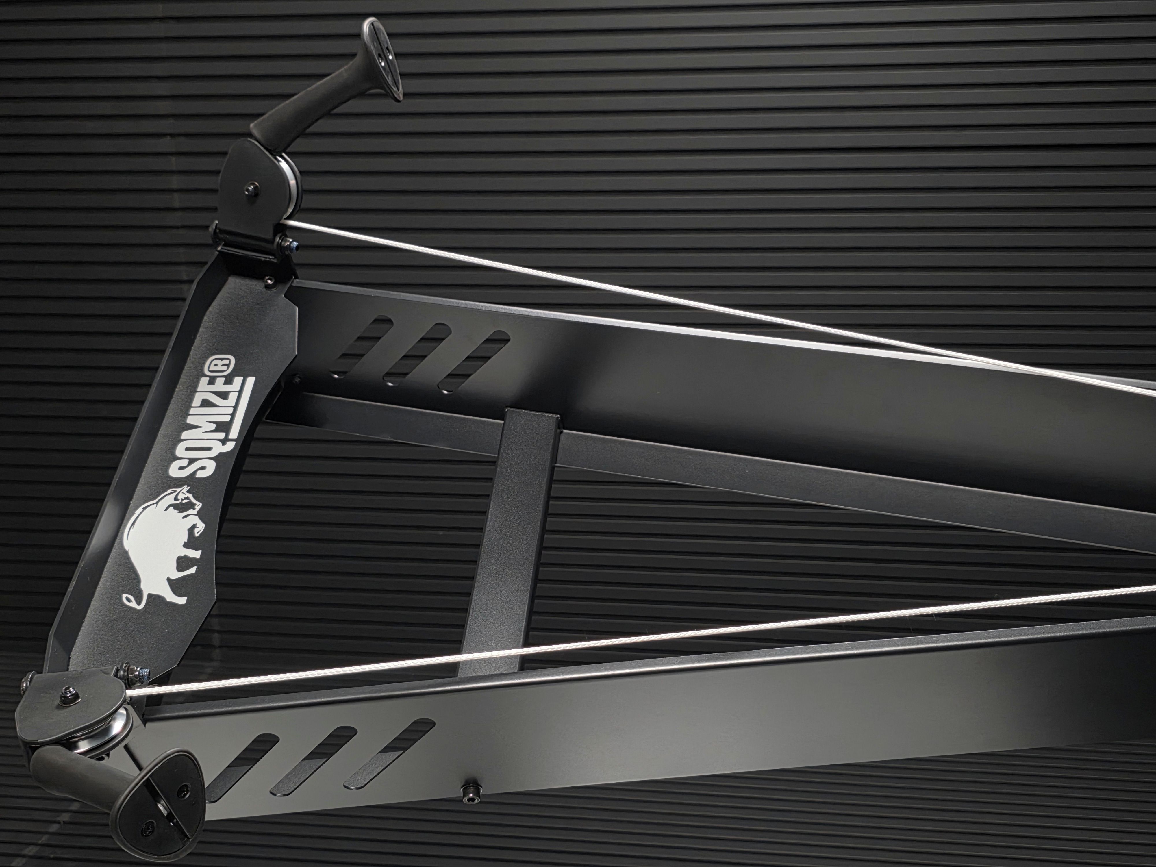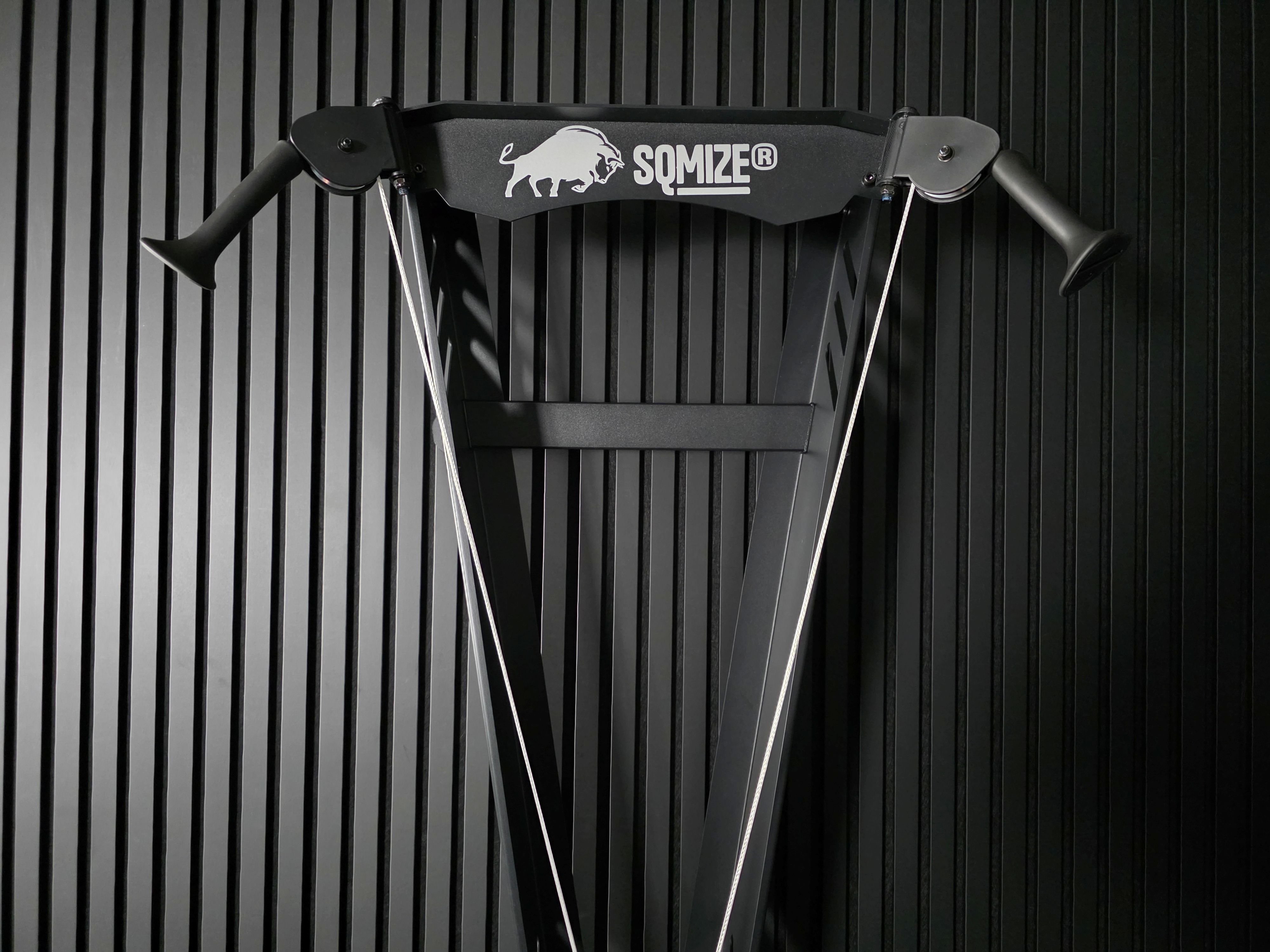 Für eine natürliche und ergonomische Armbewegung sorgen die arretierenden Griffe auf hochwertigen Aluminium-Rollen. Mit einer Griffbreite von 46 cm und schwenkbaren Haltern (verstellbar von 30 – 60 cm) passt sich das Gerät perfekt jeder Körperstatur an. Das extrem reißfeste Antriebskabel ist auf höchste Zugkraft geprüft und garantiert einen sicheren Betrieb. Die massive Konstruktion mit einem 32 mm starken Stützbügel und Gummipuffern sorgt für absolute Standfestigkeit und schont gleichzeitig den Untergrund.