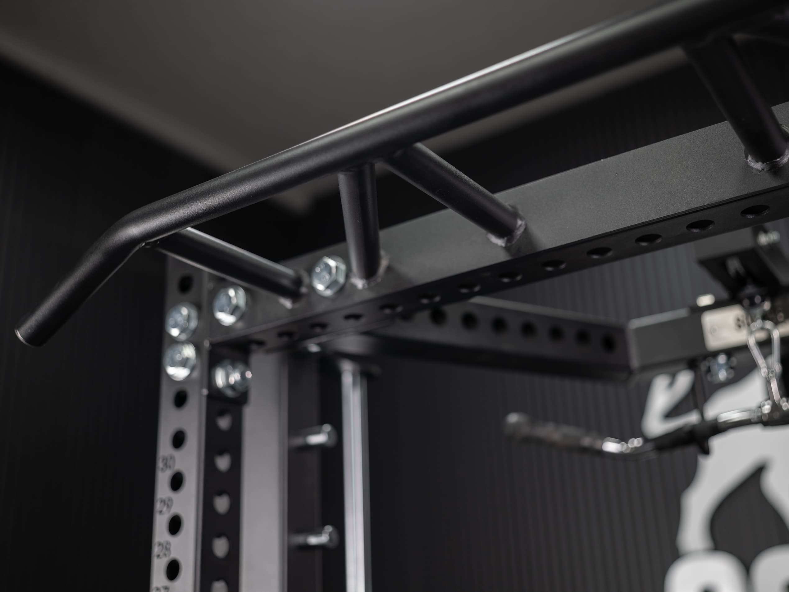 Integrierte Halterungen für 50mm Scheiben und Langhanteln.