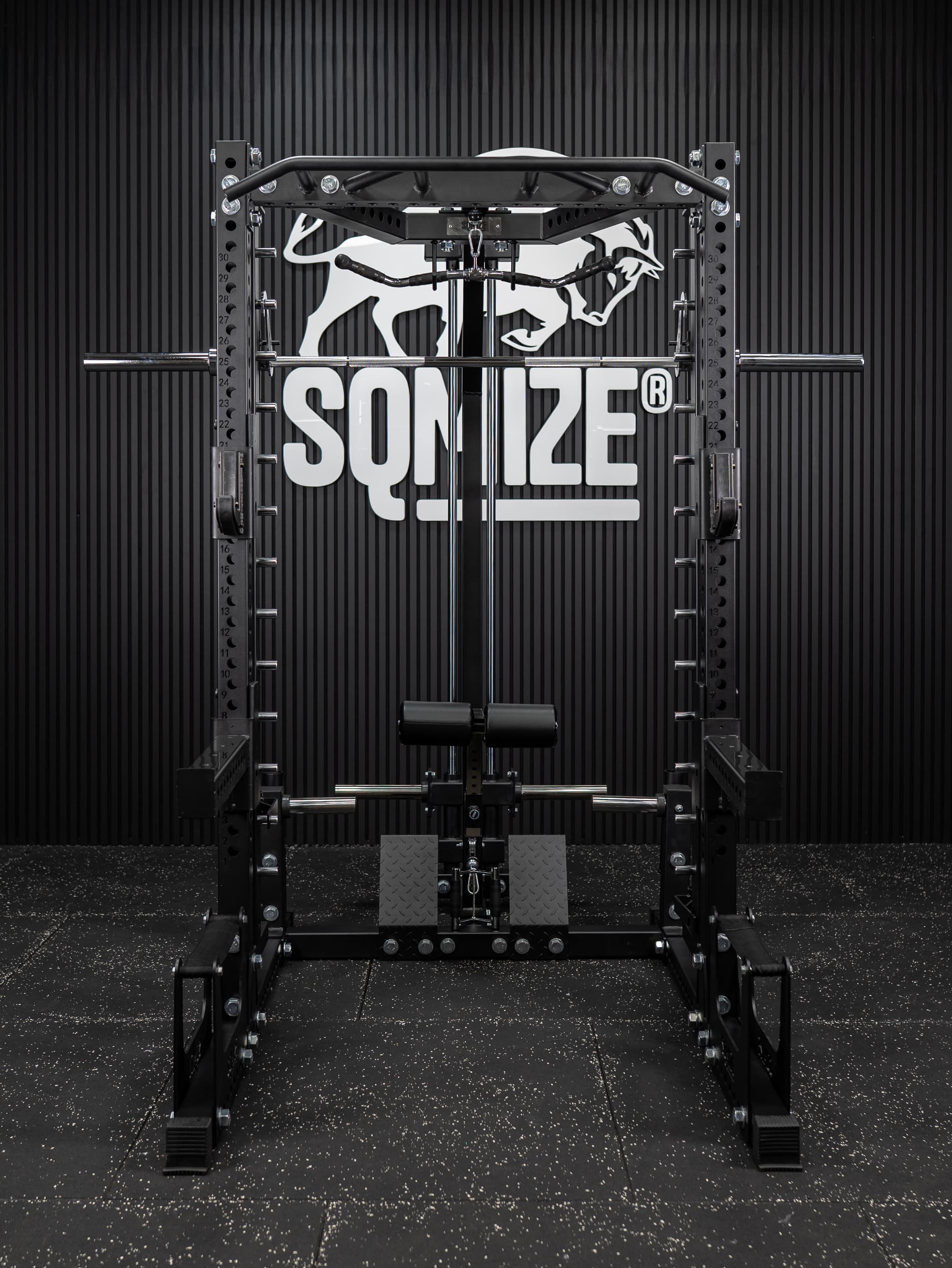 SQ-S550RSR Premium Bison All-in-One Power Rack, Linear Smith, Half Rack & Latzug