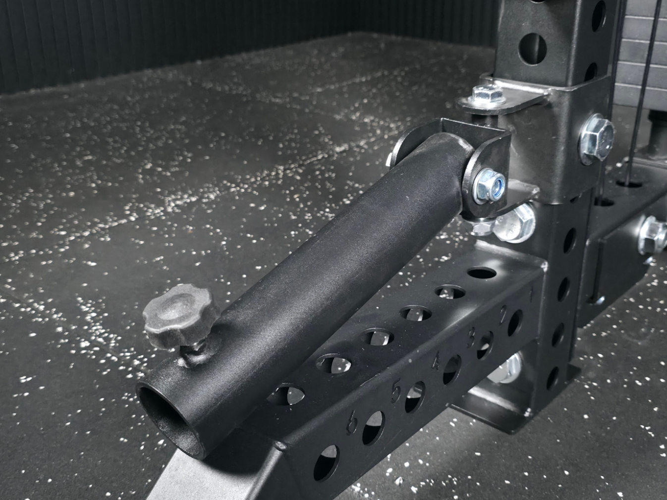- SQ-S955-BH Bar Holder: Vertikaler Halter zur platzsparenden Aufbewahrung einer 50 mm Hantelstange direkt am Rack.