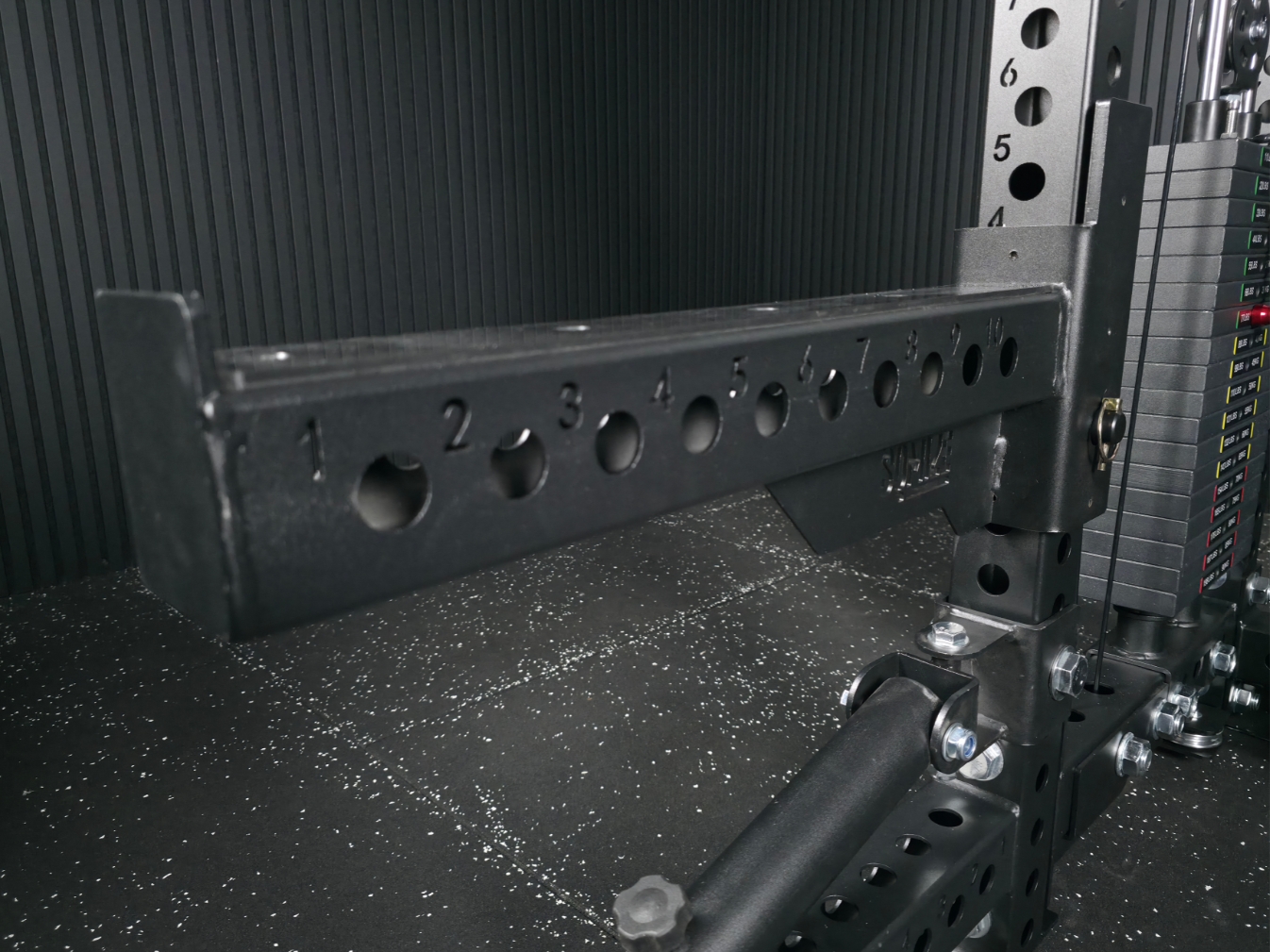 - SQ-S955-LEQ Jammer Arms:Schwere Notablagen mit Nylon-Schutz für sicheres Training außerhalb des Racks.