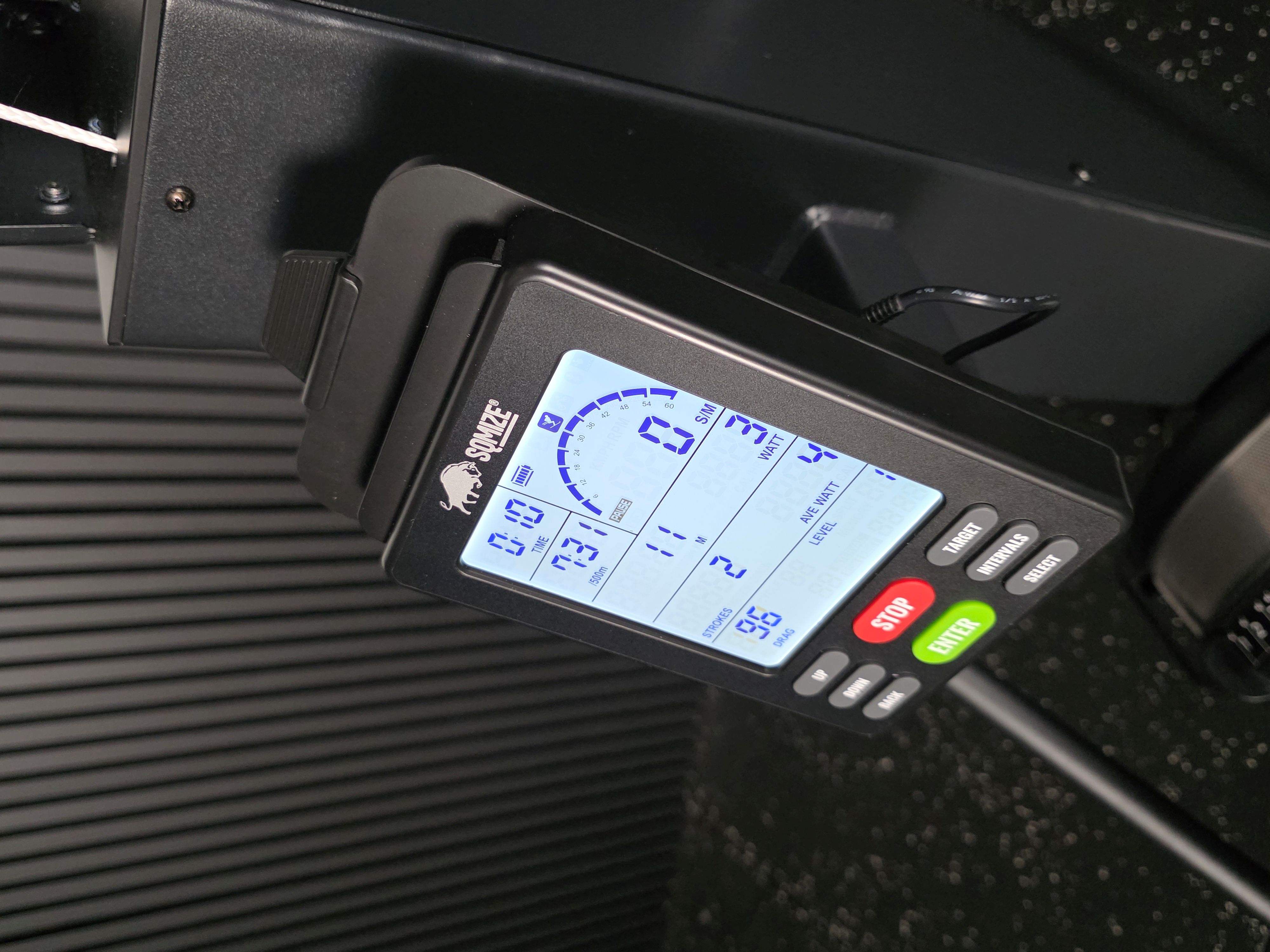 - Messwerte: Schlagfrequenz, Zeit, Zeit/500m (inkl. Durchschnitt), Schläge (Frequenz/Gesamt), Zyklus, Widerstandsstufe, Watt (inkl. Durchschnitt), Puls, Gesamtmeter (inkl. Prognose/30min), Kalorien (inkl. Kalorien/Std.)