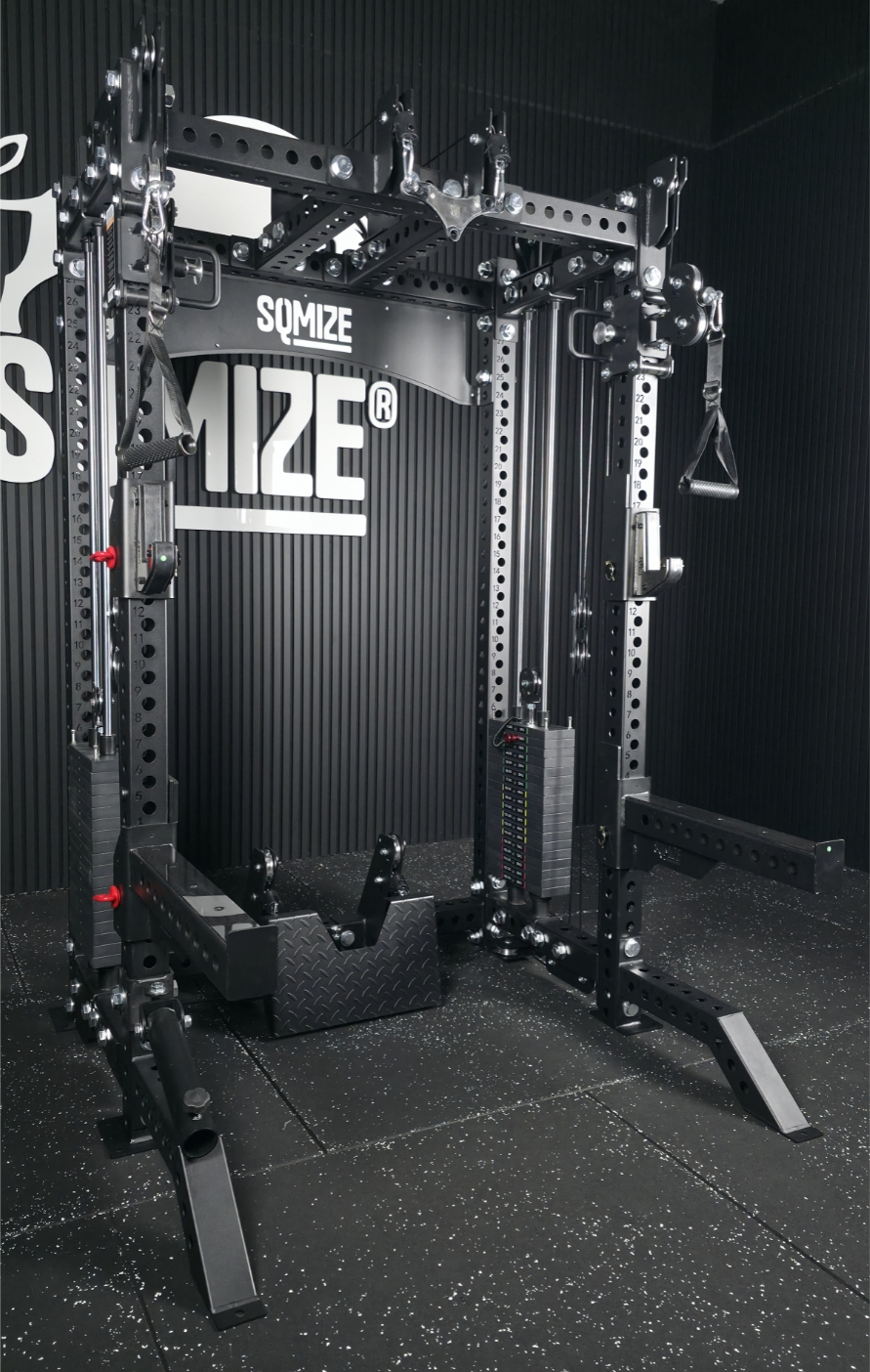 Gebaut aus dem im Studiobereich bewährten 75 x 75 x 3 mm Stahlprofil, bietet das SQ-S800RSR höchste Verarbeitungsqualität und eine Zertifizierung nach EN ISO 20957. Kugelgelagerte Alu-Rollen und eine präzise Führung sorgen für einen extrem geschmeidigen Lauf, während das integrierte Half Rack maximale Sicherheit bei freien Langhantelübungen garantiert. Hier steht massive Präsenz für höchsten Trainingskomfort und Workout-Qualität.